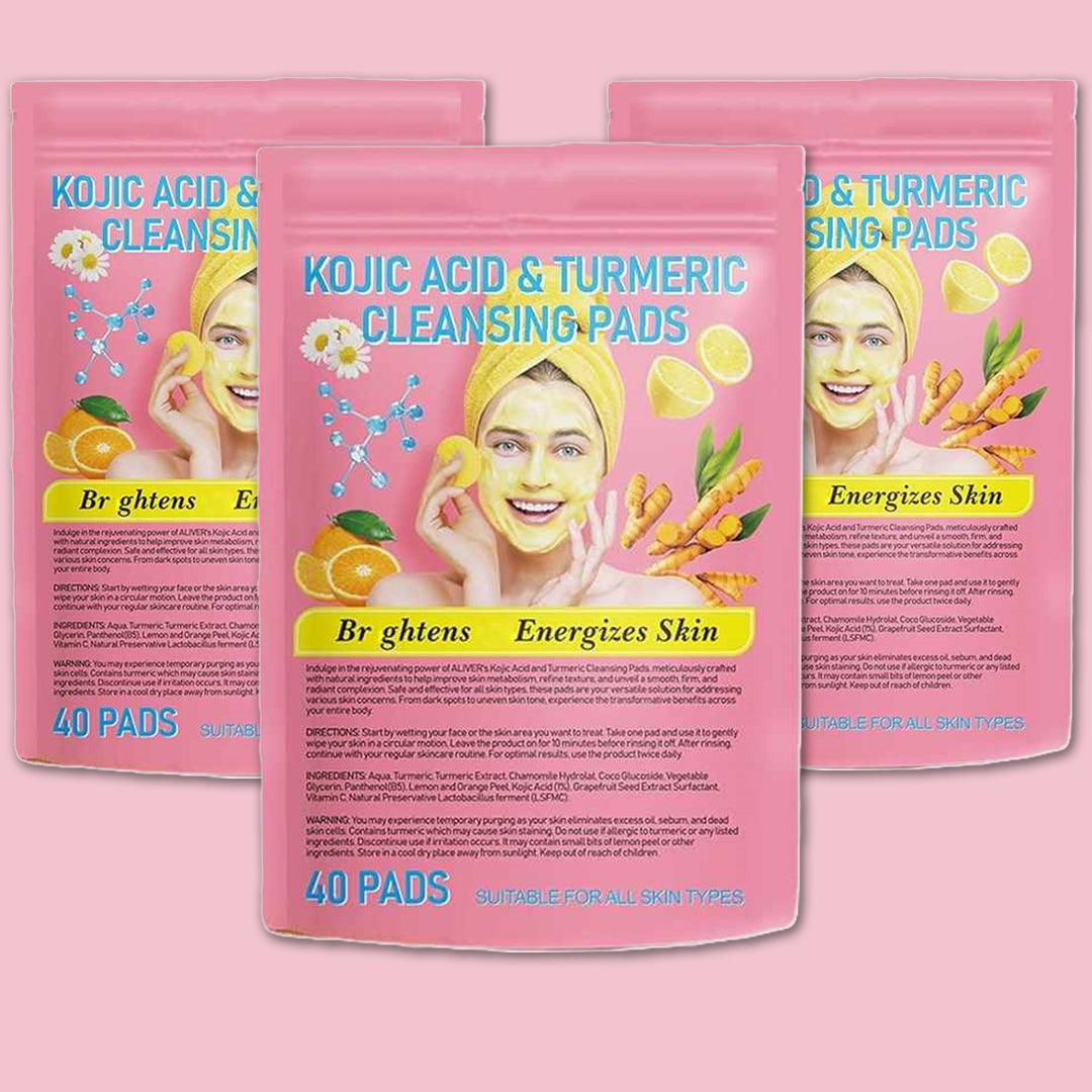 The three main ingredients commonly found in Turmeric and Kojic Acid Pads (used for skin brightening and cleansing) are: